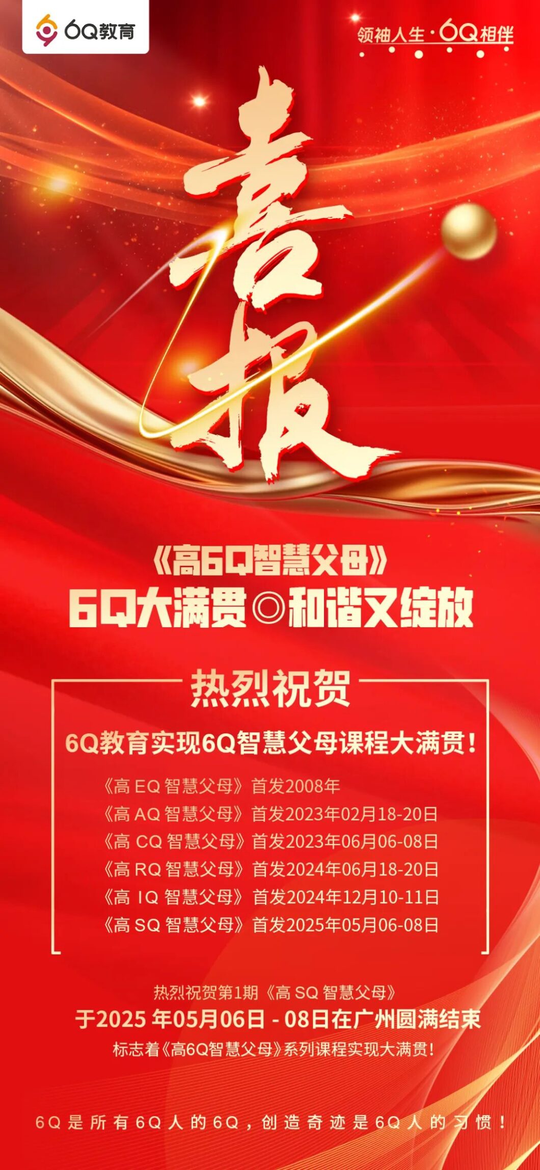 展望未来,6Q刘中良老师如是说:“到2030年,争取把《高SQ智慧父母》的课程体系、导师体系和市场规模等,打造达到去年《高EQ智慧父母》的水平和影响力。”《高 SQ智慧父母》第一期学习班圆满结束,标志着6Q教育组织研发的《高6Q智慧父母》系列课程实现大满贯。6Q 大满贯 ◎ 和谐又绽放!
