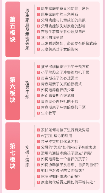 课程分为七大板块:家庭教育概述、发展心理学、亲子关系指导、家庭养育指导、原生家庭及亲密关系、指导干预、实操+演练,完成了从理论学习到方法指导,再到场景应用和落地实操的学习闭环,总计69节课程,系统全面,知识体系涵盖完整。